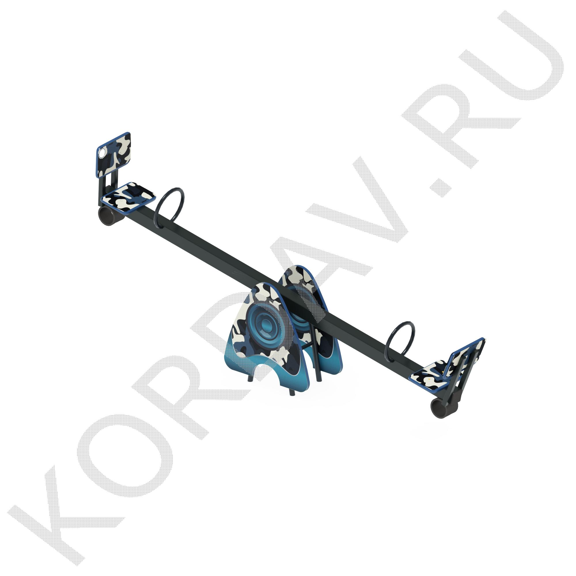 Опора: Состоит из сварной конструкции из квадратной профильной трубы 40х40 мм с толщиной стенки 2 мм и круглой трубы наружным диаметром 21 мм, двух втулок с установленными в них шарикоподшипниками. Размер опоры: 420х480х505 мм. Снаружи опоры закрыты декоративными накладками, сделанными из берёзовой фанеры толщиной 18 мм, окрашенными в синий и жёлтый цвет. 1 шт
