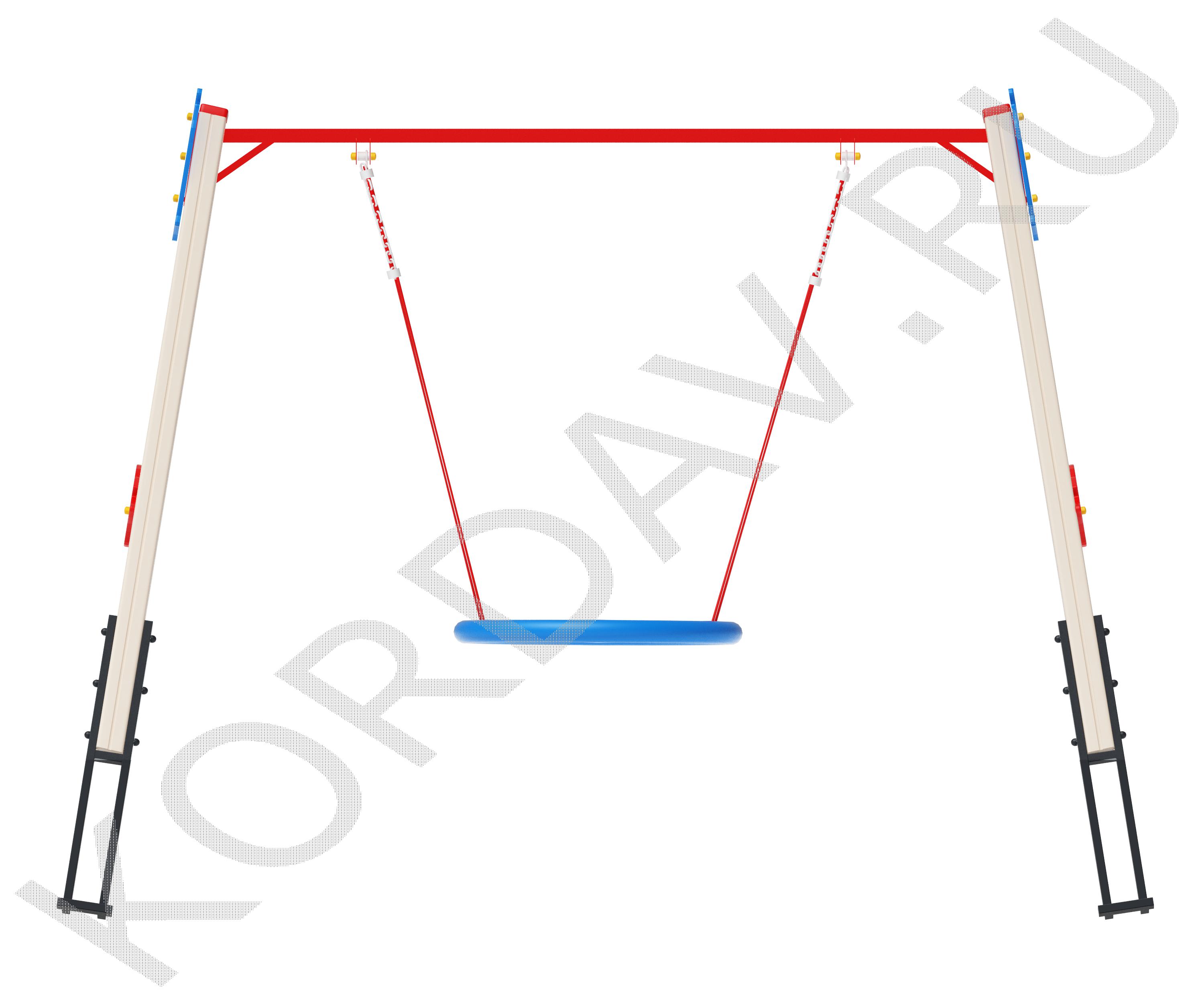 Сиденье «Гнездо»Диаметр сиденья — 1000 мм. Плетение внутри кольца выполнено из четырёхпрядного армированного каната диаметром 16 мм. Качели комплектуются подвесами из шестипрядного армированного каната. Длина подвесов — 1340 мм. Подвес из цепи. Цепь: короткозвеньевая, не калиброванного класса, прочность металла Т(8), диаметр сечения звена цепи 6 мм. Цепи соединены в единый подвес наконечником для крепления к перекладине качели. Наконечник выполнен из втулки с подшипниками и скобы.